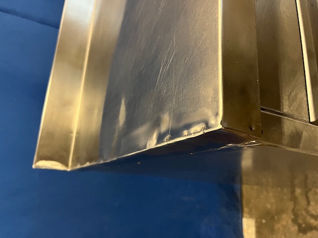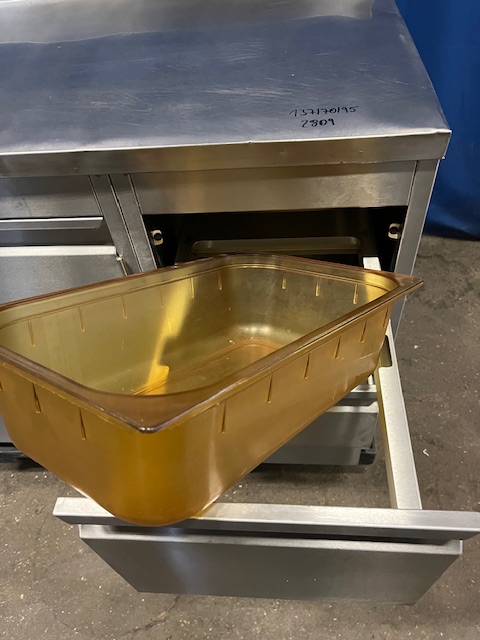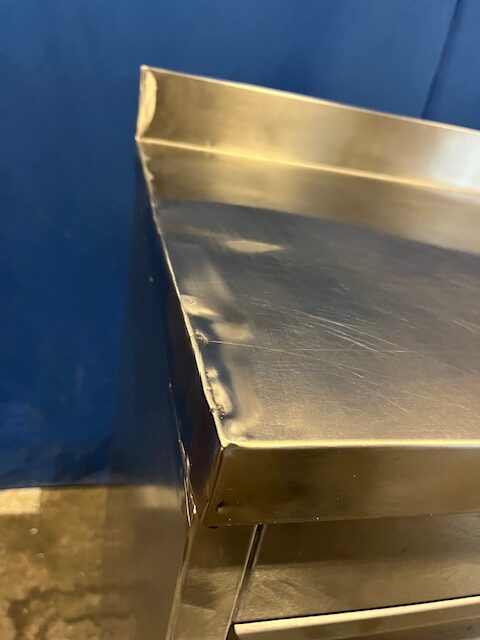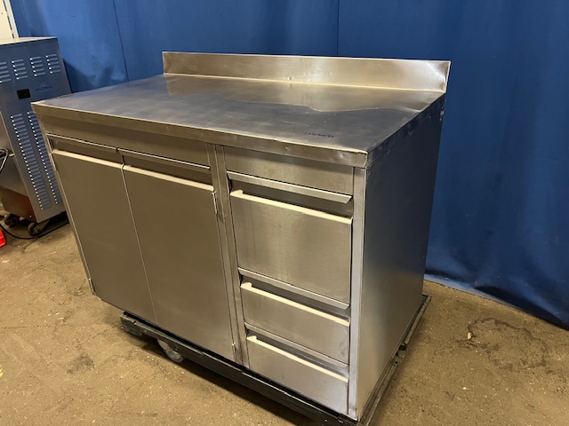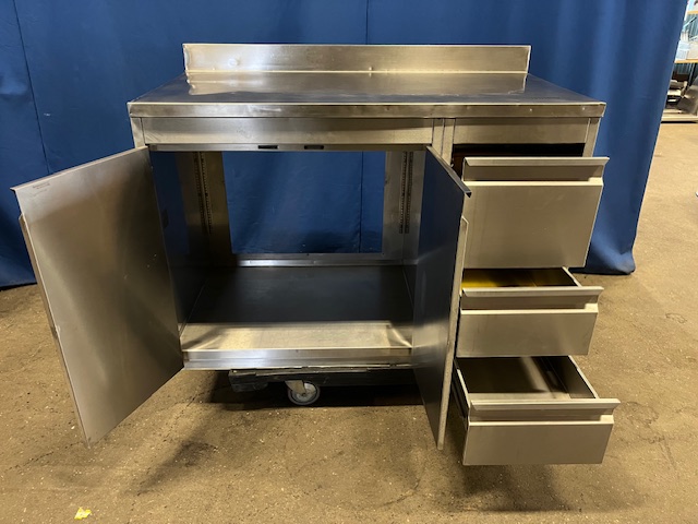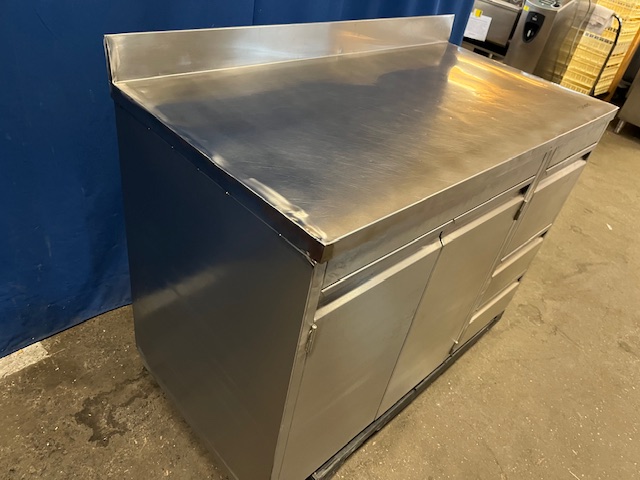 3 Schubladen rechts, erste Schublade für 1/1 GN, mittlere Schublade 36x60x16 cm, untere Schublade 36x60x11 cm, linksseitig Fach mit 2 Türen 100 cm, Aufkantung hinten, massive Verarbeitung