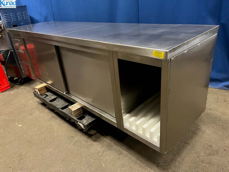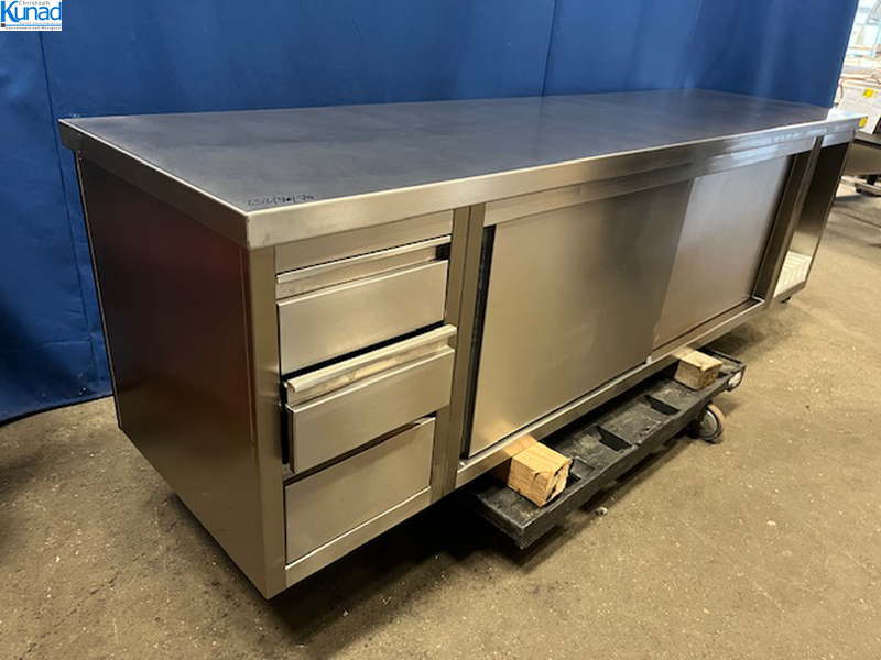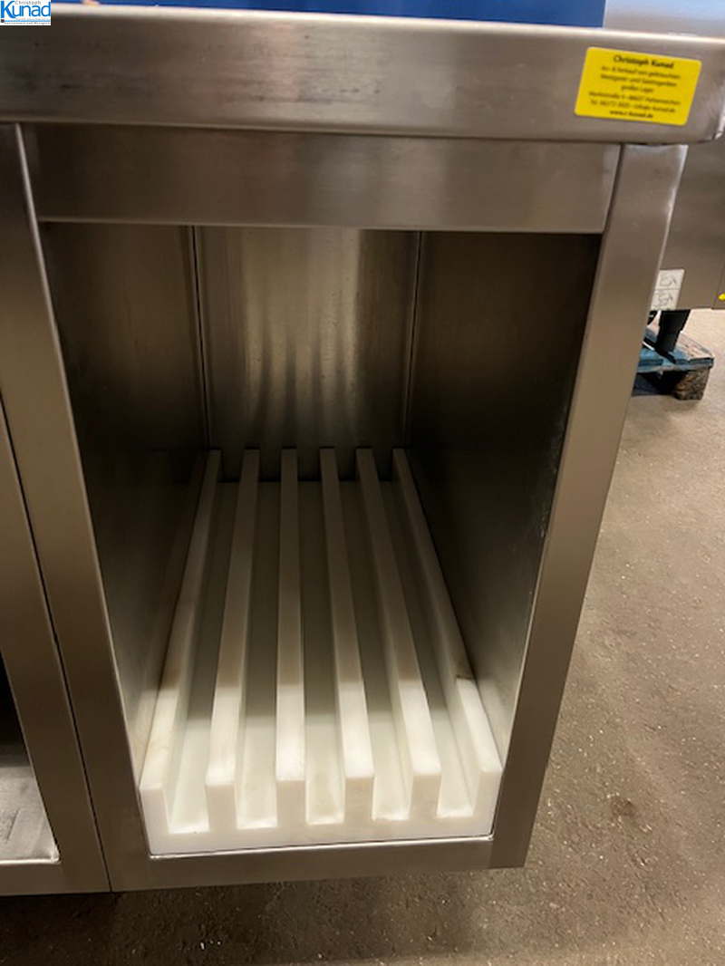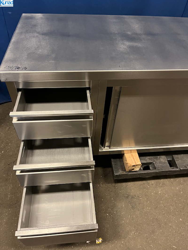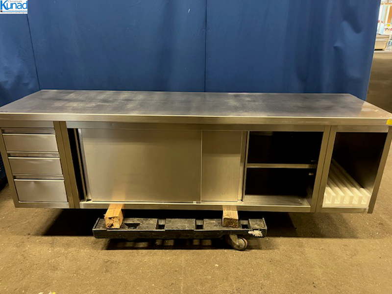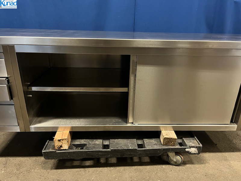 für Sockelmontage, frei im Raum aufstellbar, mit Schubladenblock links, 2 Schubladen 30x50x10 cm, 1 Schublade 30x50x15 cm, 2 Schiebetüren mittig mit 160 cm, Mittelfach verstellbar, Staufach rechts 32 cm mit Einsatz zur Aufbewahrung von Schneidbretter, Tablett o. Ä., massive Ausführung, Füße optional auf Anfrage, passend zu Art.Nr. 2218