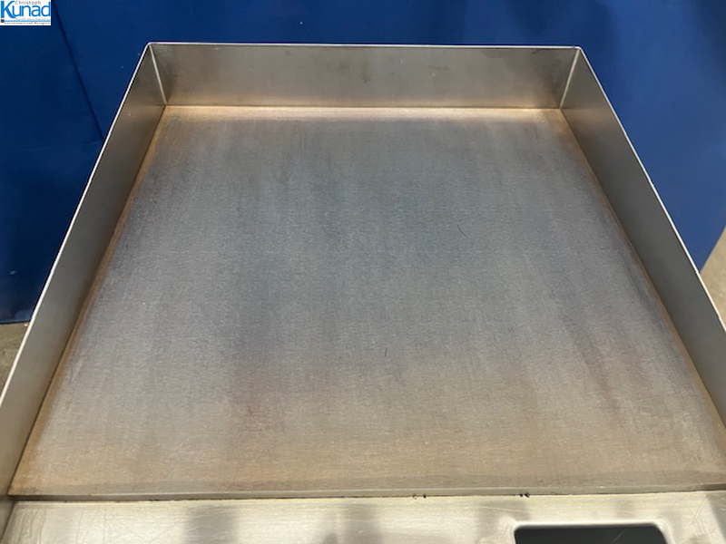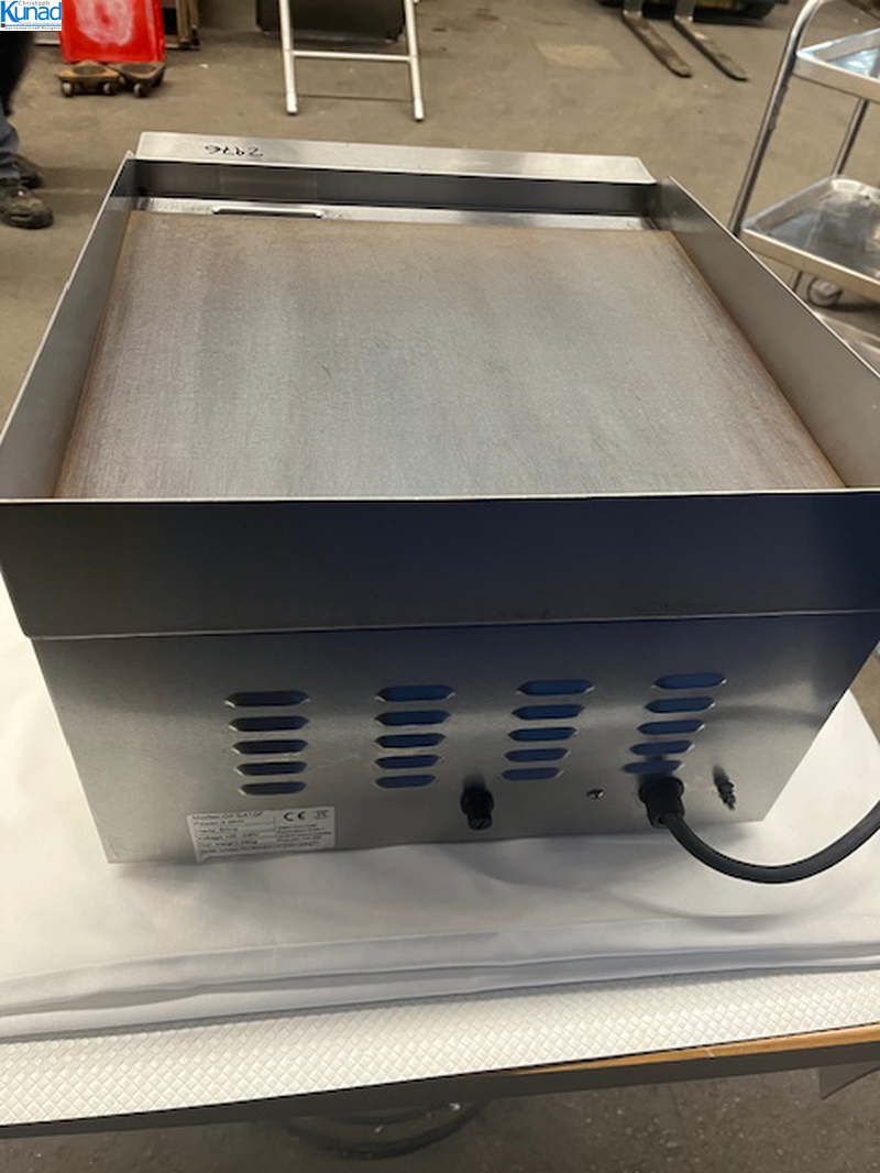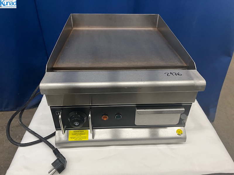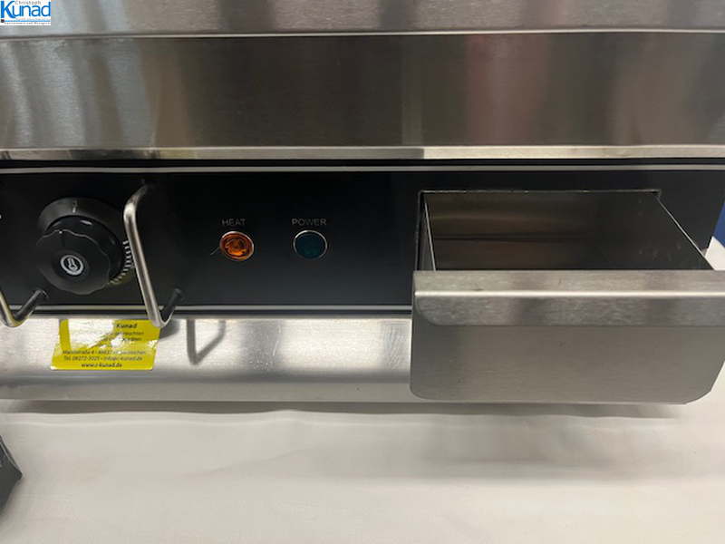 hygienisches Arbeiten durch Fettfangrinne vorne, robuste Stahlgrillplatte 12 mm dick mit Spritzschutz, Bratfläche 40×40 cm, Temperatur stufenlos regelbar bis 300 °C, Fettschublade, Baujahr 2020