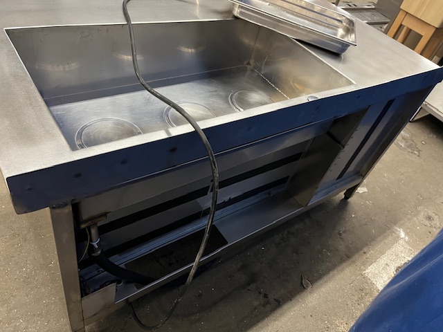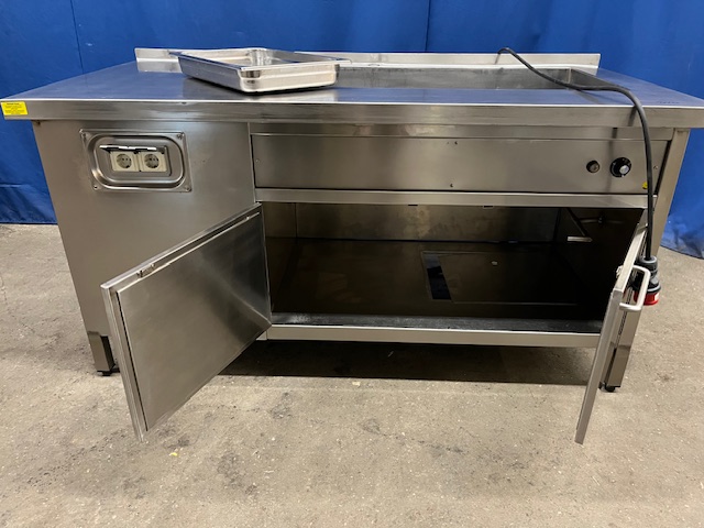 Edelstahl, 400 V, 5,2 kW, 7,6 A, Arbeitsfläche mit Wasserbad für 3 x 1/1 GN, Gesamtmaß 171x83x86 cm, großer Stauraum mit 2 Flügeltüren seitlich, 2 Flügeltüren vorne, Temperatur stufenlos einstellbar