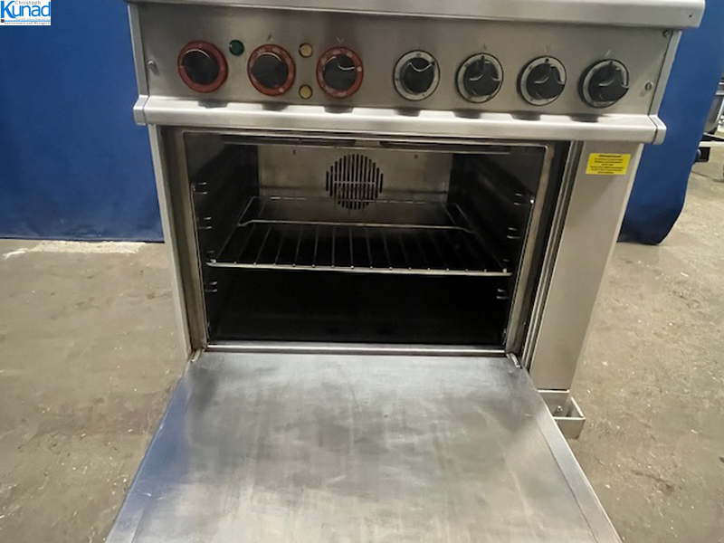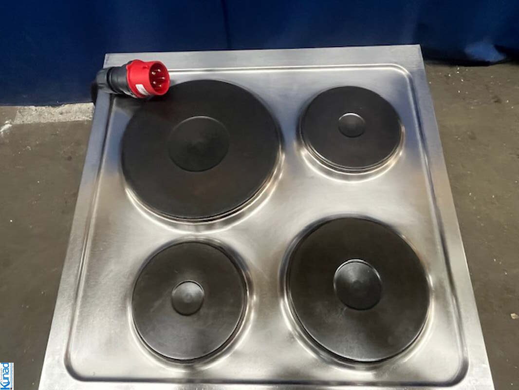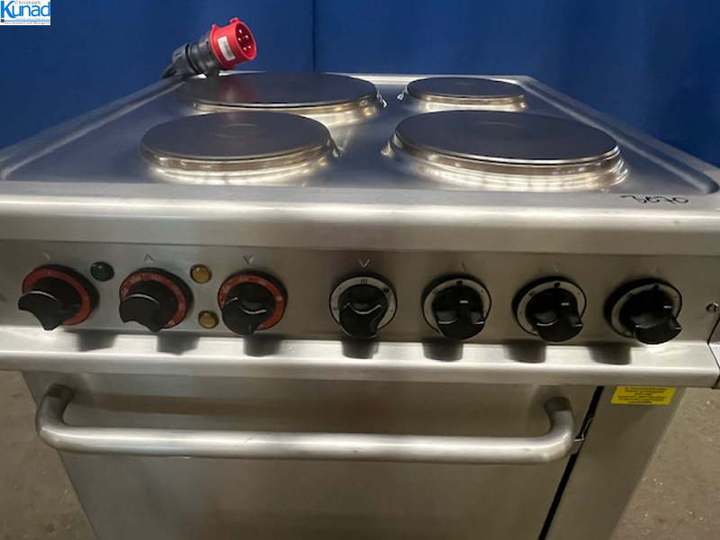 14,1 kW, 30 A, 4 Kochplatten mit 30/22/18/18 cm Durchmesser, mit Backrohr 53x38x354 cm, Rostgröße 53×40 cm, Ober- und Unterhitze getrennt regelbar von 50°C bis 300°C, auf fahrbarem Untergestell /Wagen, mit Feststellbremsen, Gerätemaß 70x70x71 cm, Gesamtmaß mit Wagen 74x70x84 cm