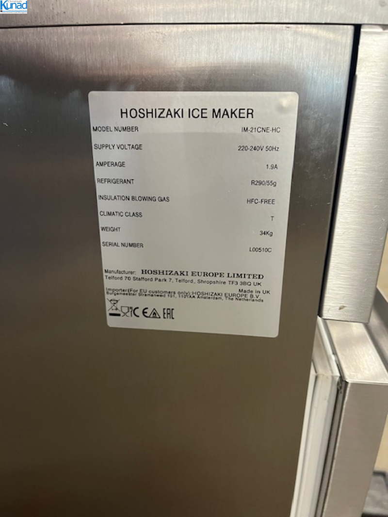Modell IM-21CNE-HC, 230 V, 0,43 kW, 1,9 A, Speicherkapazität 11,5 kg, Eiswürfelgröße 28x28x32 mm, Stellmaß 40x46x78 cm, Kältemittel R290, mit Vorschaltgerät zur Wasserenthärtung