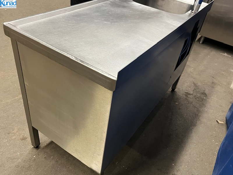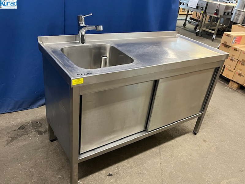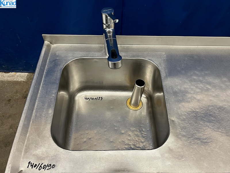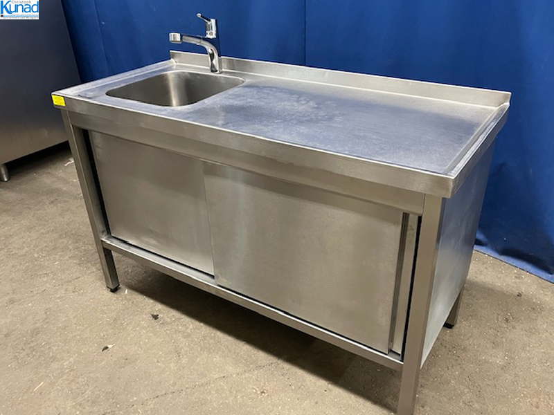 1 Becken links 40x40x25 cm, Gastro-Armatur, Abtropffläche rechts 85×60 cm, 2 Schiebetüren, Aufkantung hinten