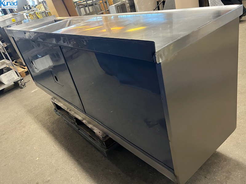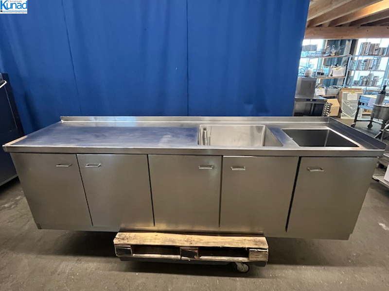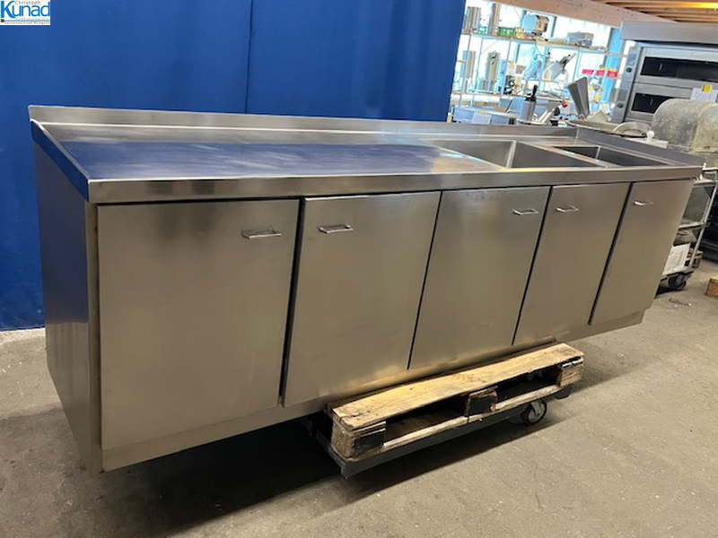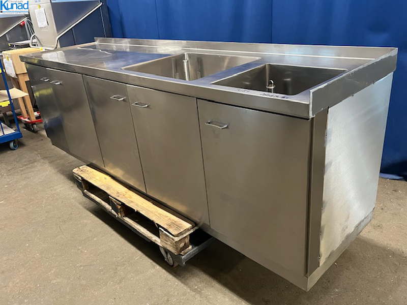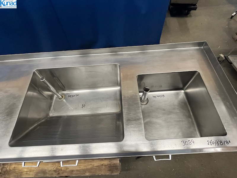 1 großes Becken innen abgeschrägt 60x50x30 cm, 1 Becken 40x40x25 cm, Aufkantung hinten und rechts, Wulstrand, 3 Stauraum-Fächer mit Flügeltüren