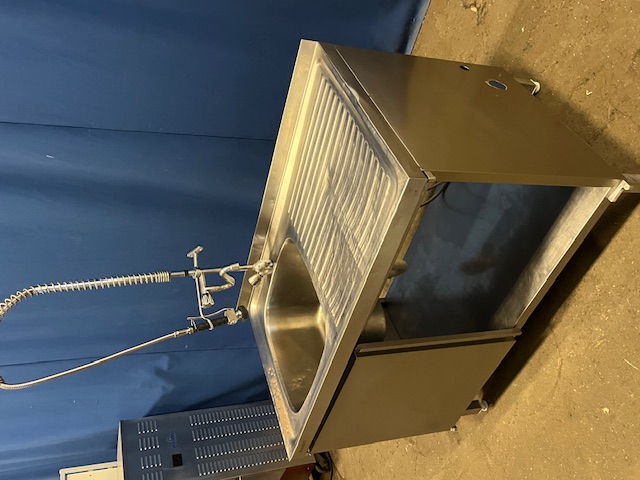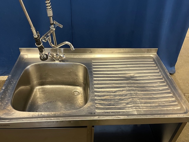 mit Pendelbrause, 1 Becken links 50x50x25 cm, Abtropffläche rechts 50 cm, Wulstrand, Aufkantung hinten, starke Gebrauchsspuren