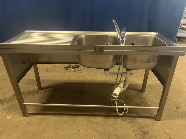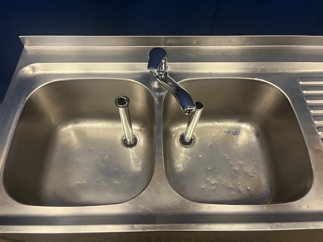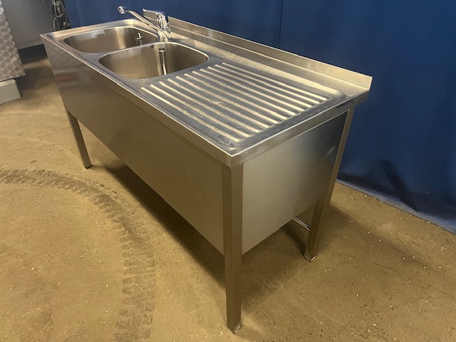 2 Becken links 40x38x25 cm, Abtropffläche rechts 60 cm, Wulstrand, Aufkantung hinten, Armatur