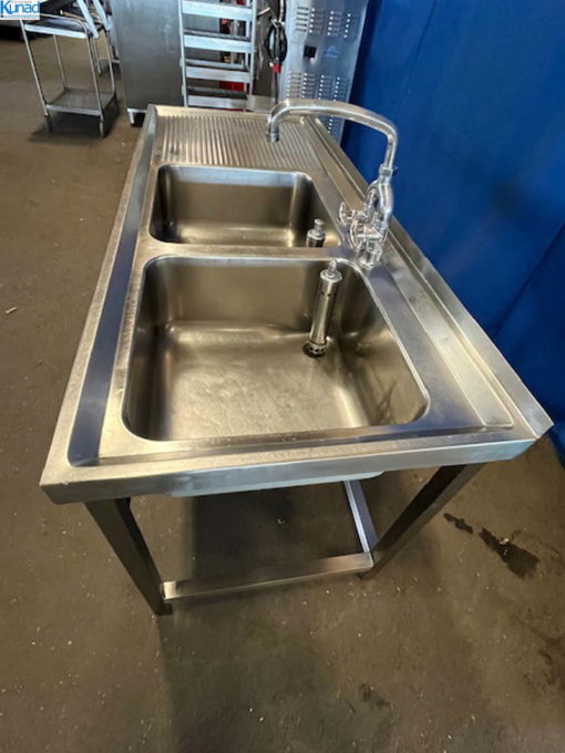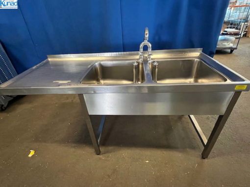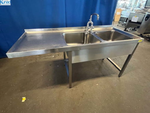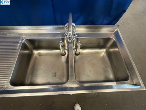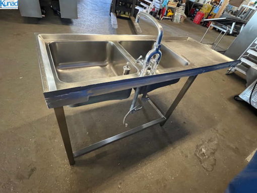 2 Becken rechts 50x50x25 cm, Armatur, Abtropffläche links 55 cm, links Rücksprung 60 cm für Spülmaschine o. ä., stabile Ausführung
