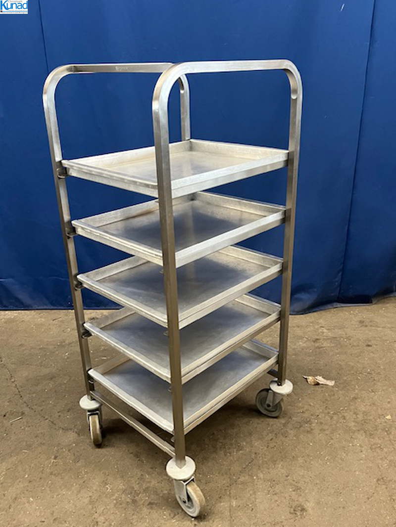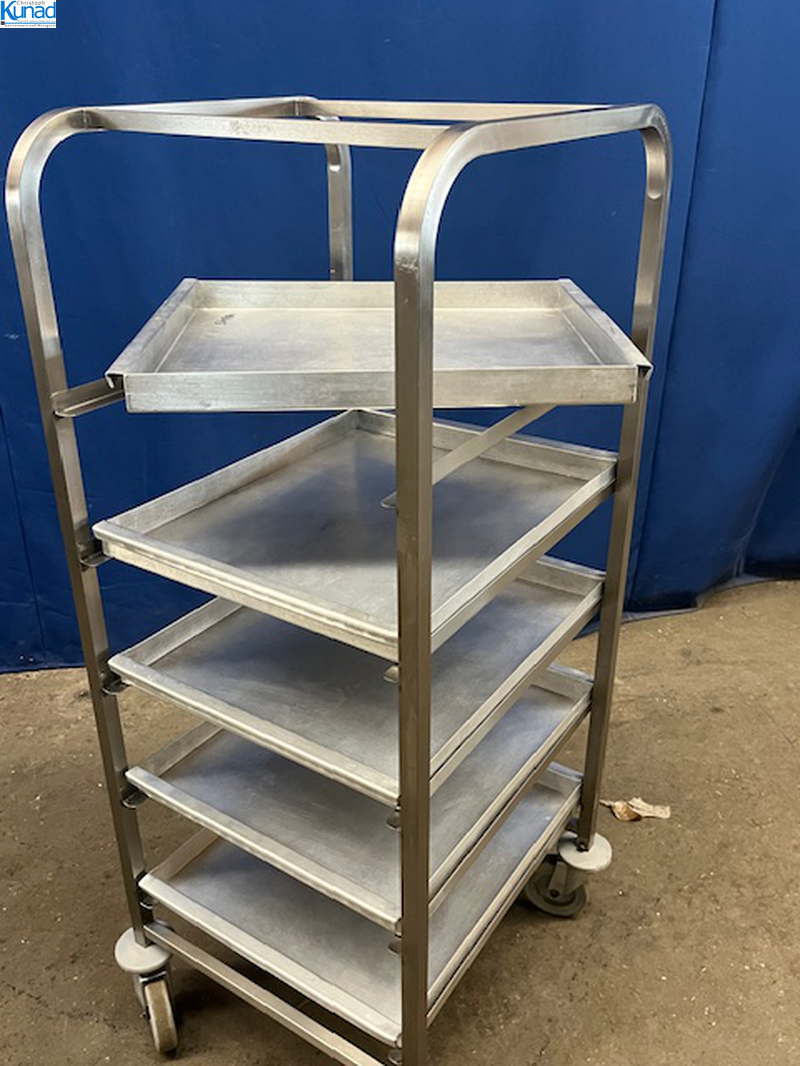 Wagen mit Lenkrollen, leicht gängig, 5 Tabletts mit 5 cm Rand ringsum entnehmbar, Abstand zwischen den Böden 20 cm