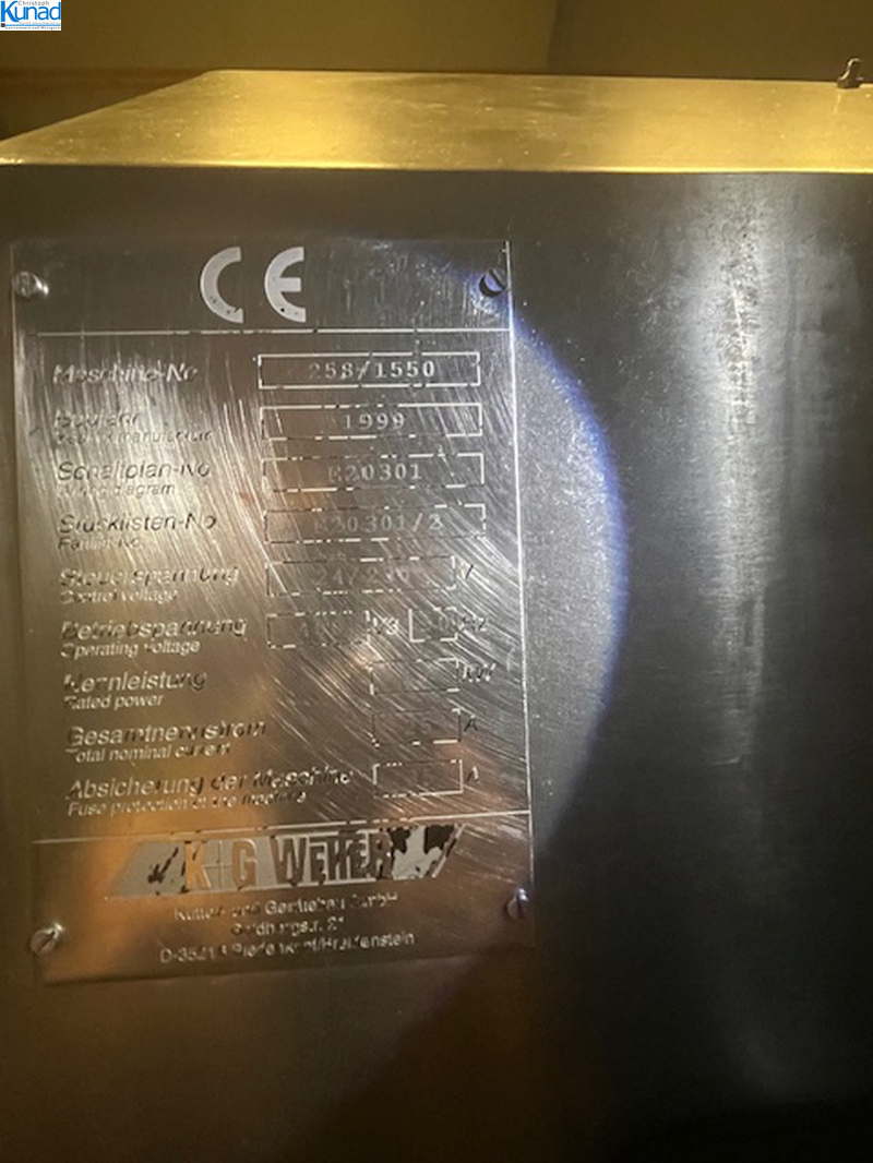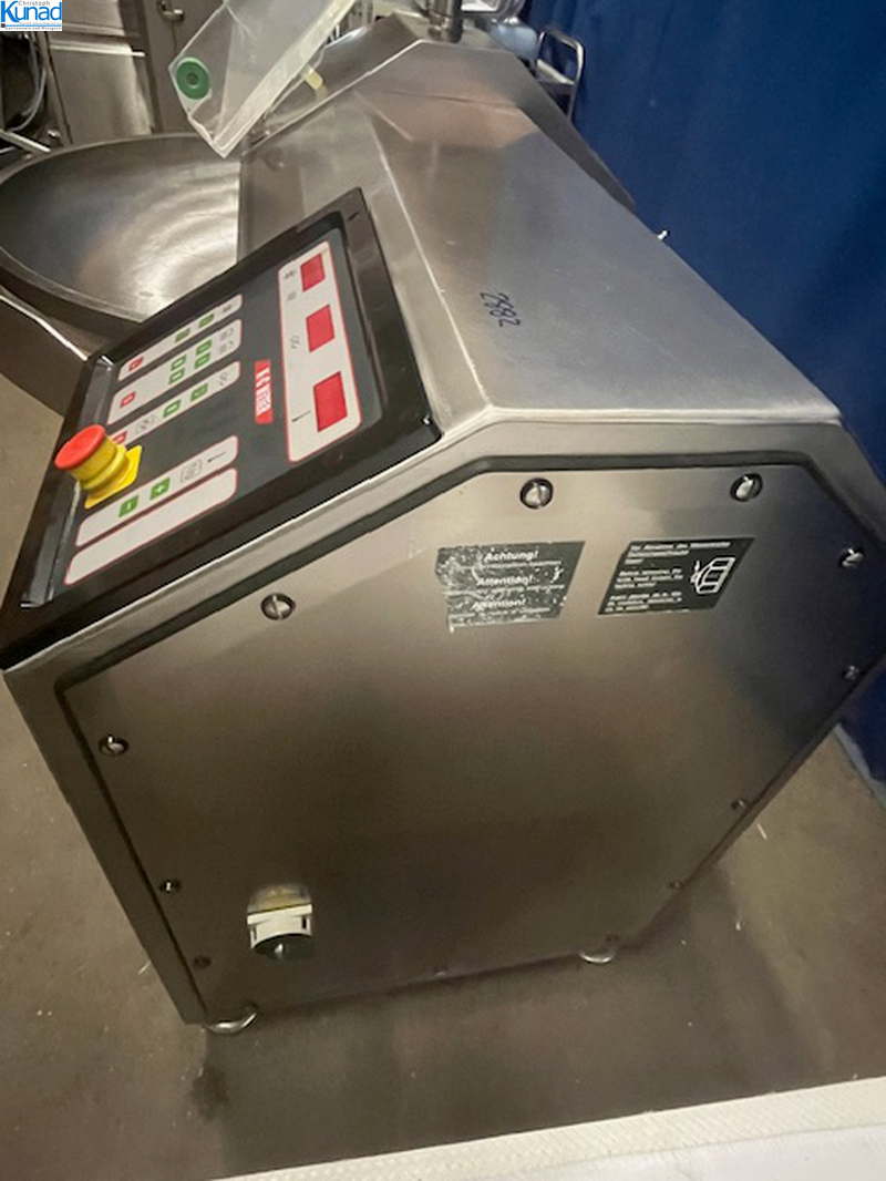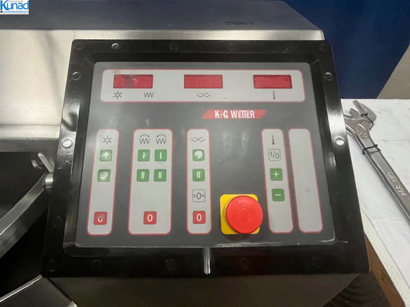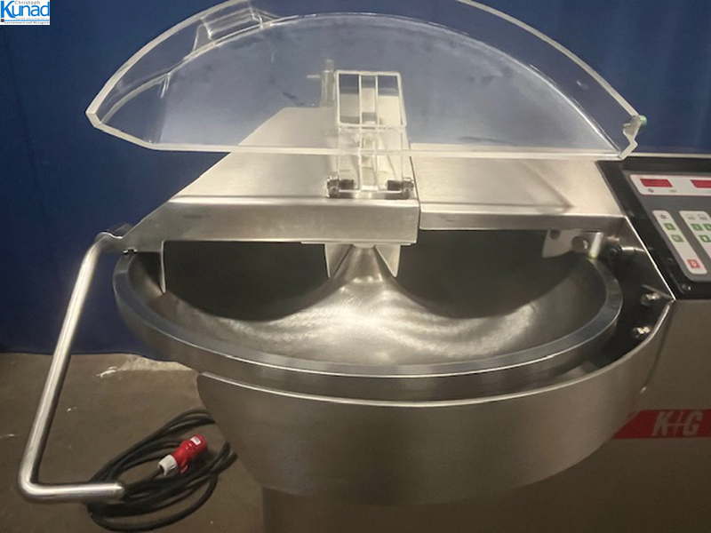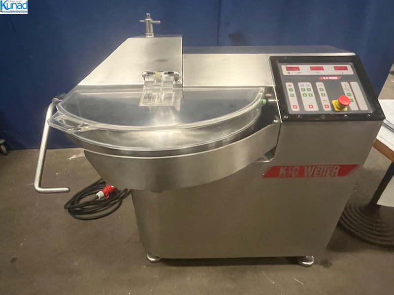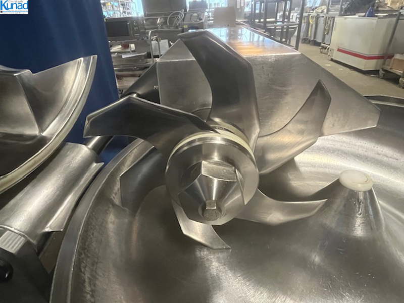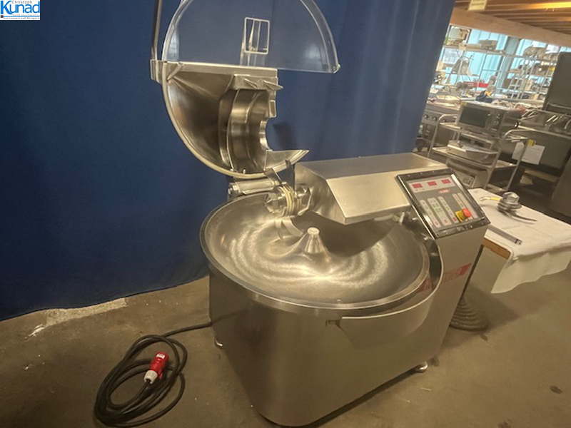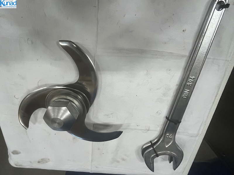 400 V, 12 kW, 25 A, Absicherung 35 A, Stecker 32 A, mit 6er Messerkopf, zusätzlich 3er Messerkopf und Werkzeug, Messer geschliffen, mit Temperaturanzeige, Mischgang vorwärts und rückwärts mit jeweils 2 Stufen, Schüsselumdrehung mit 2 Geschwindigkeiten, 2 Messerwellengeschwindigkeiten, mit Messerwellenbremse, Gewicht 850 kg