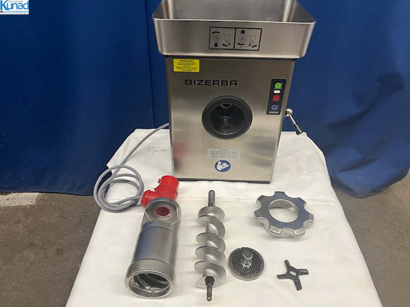 400 V, 2,5 kW, 6,9 A, Stecker 16 A, Durchmesser 82 mm, Enterprice-System mit 1 Messer und 1 Scheibe 3 mm, Stellmaß 35x40x48 cm,wolft Fleisch in roher, gekochter oder geräucherter Form. Selbst durchwachsenes Fleisch – heiß oder kalt – Speck, Innereien, Schwarten sowie Suppengemüse lassen sich unkompliziert zerkleinern, bis 350 kg/h abhängig von Schneidgut / -satz